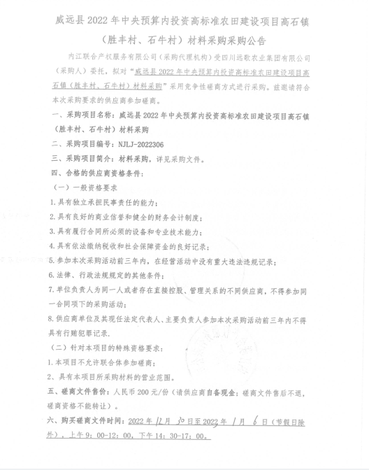 威遠縣2022年中央預算內(nèi)投資高標準農(nóng)田建設項目高石鎮(zhèn)(勝豐村、石牛村)材料采購采購公告