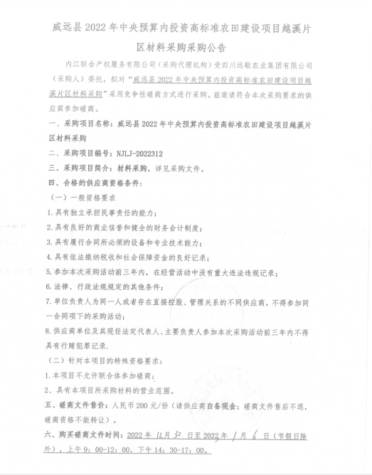 威遠(yuǎn)縣2022年中央預(yù)算內(nèi)投資高標(biāo)準(zhǔn)農(nóng)田建設(shè)項(xiàng)目越溪片區(qū)材料采購(gòu)采購(gòu)公告