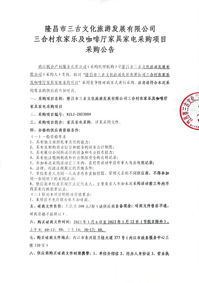 隆昌市三古文化旅游發(fā)展有限公司三合村農(nóng)家樂及咖啡廳家具家電采購項目采購公告