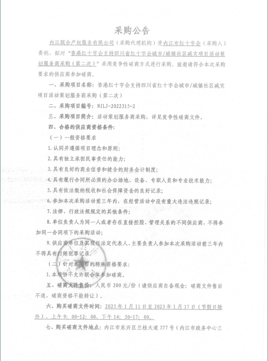 香港紅十字會(huì)支持四川省紅十字會(huì)城市/城鎮(zhèn)社區(qū)減災(zāi)項(xiàng)目活動(dòng)策劃服務(wù)商采購(gòu)(第二次)采購(gòu)公告