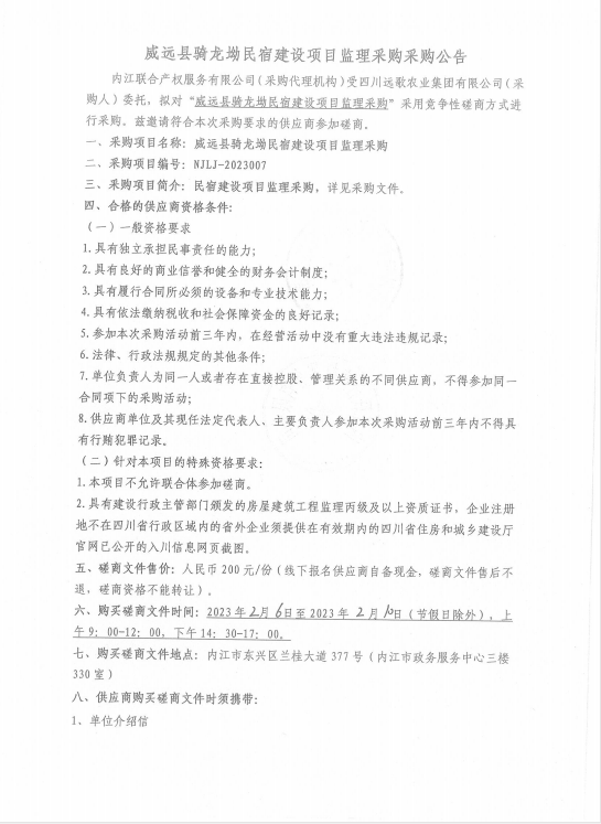 威遠(yuǎn)縣騎龍坳民宿建設(shè)項(xiàng)目監(jiān)理采購采購公告