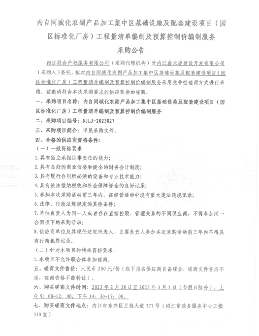 內(nèi)自同城化農(nóng)副產(chǎn)品加工集中區(qū)基礎(chǔ)設(shè)施及配套建設(shè)項(xiàng)目(園區(qū)標(biāo)準(zhǔn)化廠房)工程量清單編制及預(yù)算控制價(jià)編制服務(wù)采購公告