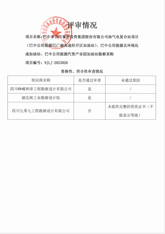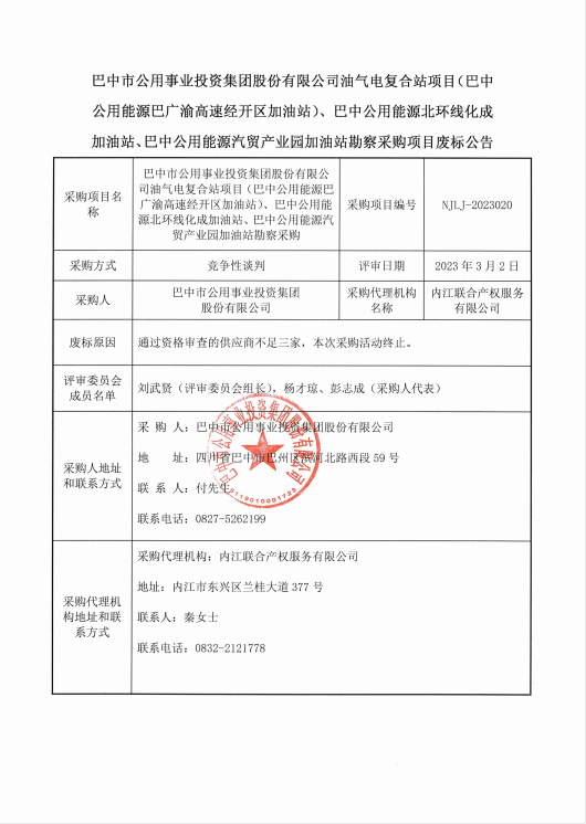 巴中市公用事業(yè)投資集團股份有限公司油氣電復(fù)合站項目(巴中公用能源巴廣渝高速經(jīng)開區(qū)加油站)、巴中公用能源北環(huán)線化成加油站、巴中公用能源汽貿(mào)產(chǎn)業(yè)園加油站勘察采購廢標(biāo)公告