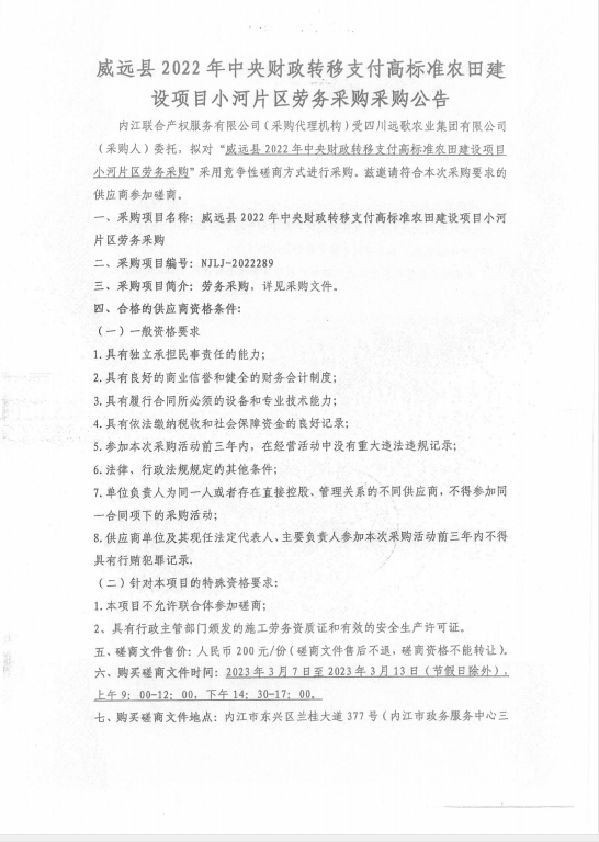 威遠縣2022年中央財政轉(zhuǎn)移支付高標準農(nóng)田建設(shè)項目小河片區(qū)勞務(wù)采購采購公告