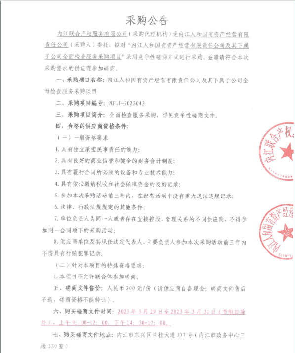 內(nèi)江人和國有資產(chǎn)經(jīng)營有限責(zé)任公司及其下屬子公司全面檢查服務(wù)采購項(xiàng)目采購公告