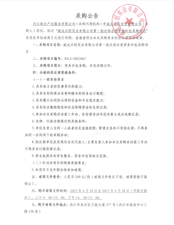威遠(yuǎn)興創(chuàng)實(shí)業(yè)有限公司第一批次綜合類勞務(wù)外包采購(gòu)項(xiàng)目采購(gòu)公告
