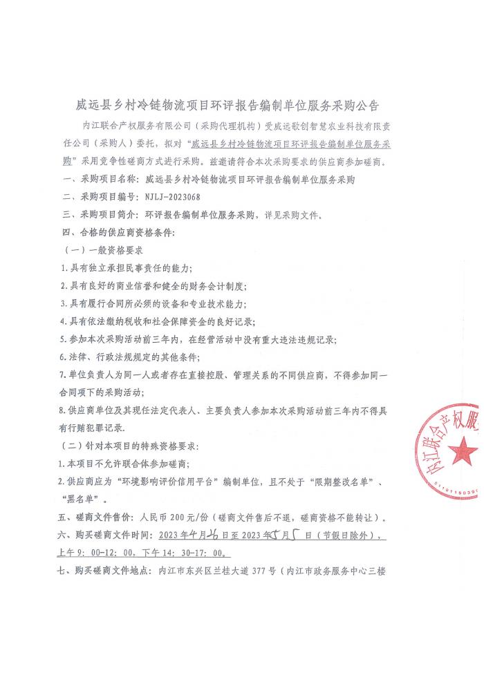 威遠(yuǎn)縣鄉(xiāng)村冷鏈物流項(xiàng)目環(huán)評(píng)報(bào)告編制單位單位服務(wù)采購(gòu)公告