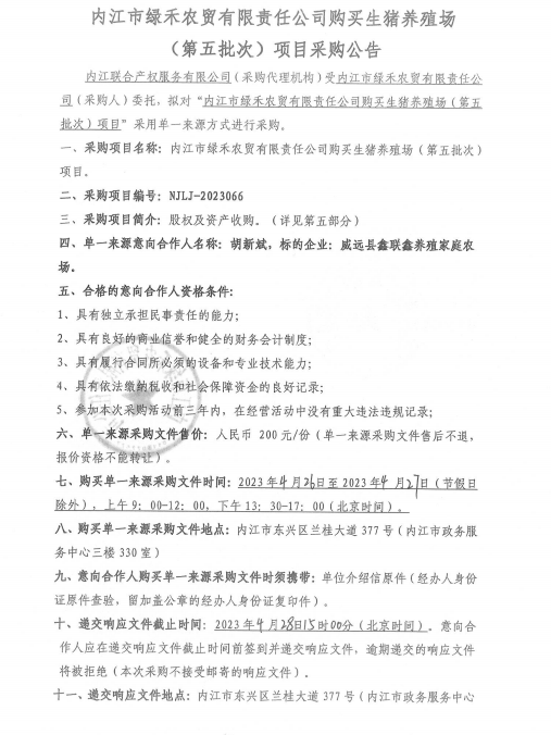 內(nèi)江市綠禾農(nóng)貿(mào)有限責(zé)任公司購(gòu)買生豬養(yǎng)殖場(chǎng)(第五批次)項(xiàng)目采購(gòu)公告