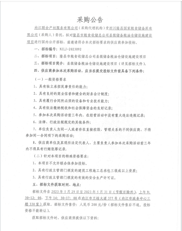 隆昌市糧食收儲(chǔ)總公司縣級(jí)儲(chǔ)備糧油倉儲(chǔ)設(shè)施建設(shè)項(xiàng)目采購公告