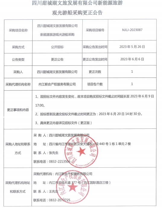 四川甜城湖文旅發(fā)展有限公司新能源旅游觀光游船采購(gòu)更正公告
