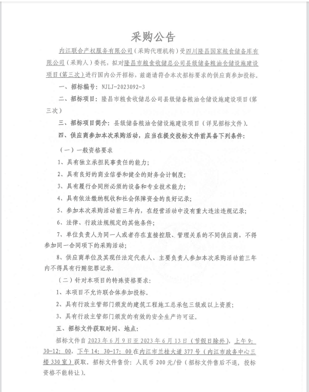 隆昌市糧食收儲總公司縣級儲備糧油倉儲設施建設項目(第三次)采購公告