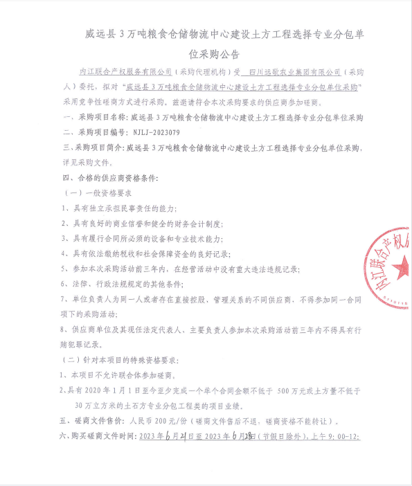 威遠(yuǎn)縣3萬(wàn)噸糧食倉(cāng)儲(chǔ)物流中心建設(shè)土方工程選擇專業(yè)分包單位采購(gòu)公告