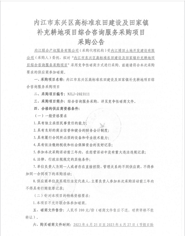 內(nèi)江市東興區(qū)高標(biāo)準(zhǔn)農(nóng)田建設(shè)及田家鎮(zhèn)補(bǔ)充耕地項(xiàng)目綜合咨詢服務(wù)采購項(xiàng)目采購公告
