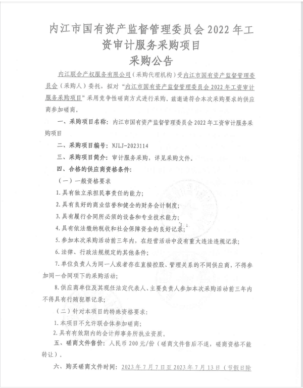 內(nèi)江市國有資產(chǎn)監(jiān)督管理委員會(huì)2022年工資審計(jì)服務(wù)采購項(xiàng)目采購公告