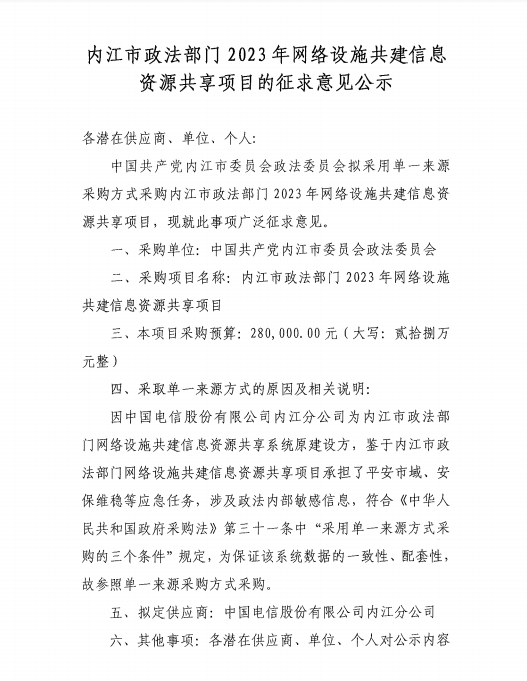 內(nèi)江市政法部門(mén)2023年網(wǎng)絡(luò)設(shè)施共建信息資源共享項(xiàng)目的征求意見(jiàn)公示
