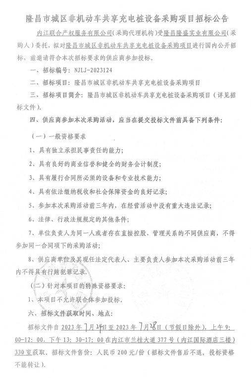 隆昌市城區(qū)非機(jī)動(dòng)車(chē)共享充電樁設(shè)備采購(gòu)項(xiàng)目招標(biāo)公告