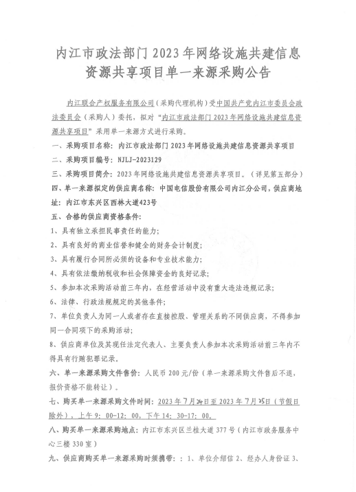 內(nèi)江市政法部門2023年網(wǎng)絡(luò)設(shè)施共建信息資源共享項(xiàng)目單一來(lái)源采購(gòu)公告