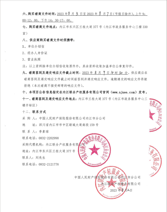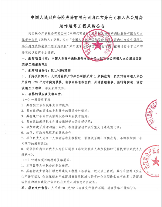 中國人民財產(chǎn)保險股份有限公司內(nèi)江市分公司租入辦公用房裝飾裝修工程采購公告