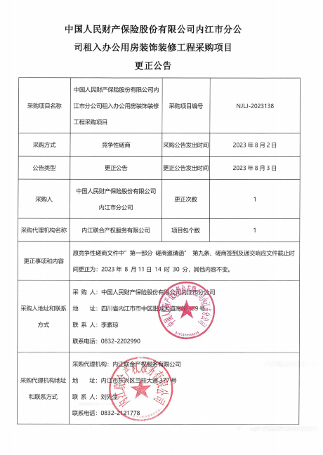 中國(guó)人民財(cái)產(chǎn)保險(xiǎn)股份有限公司內(nèi)江市分公司租入辦公用房裝飾裝修工程采購(gòu)項(xiàng)目更正公告