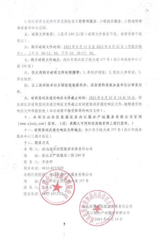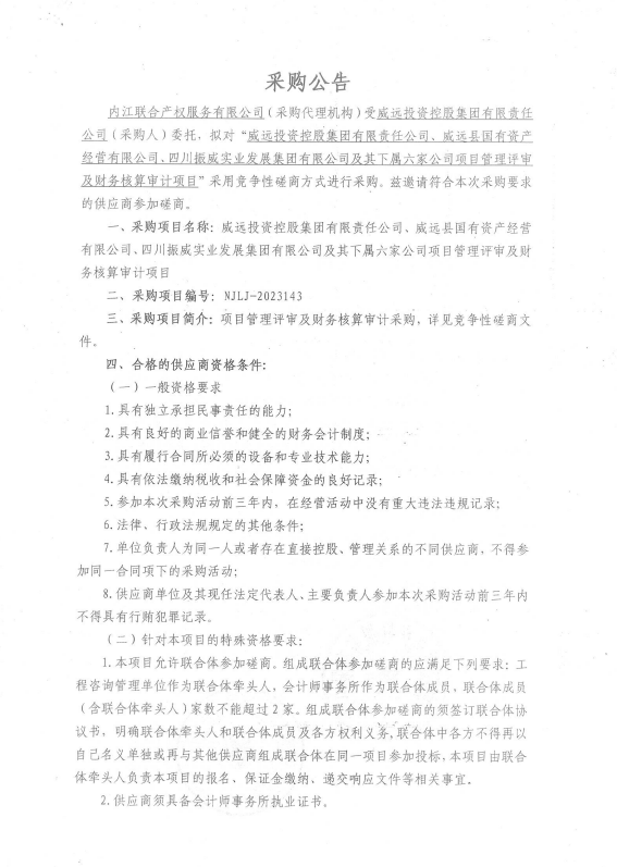 威遠(yuǎn)投資控股集團(tuán)有限責(zé)任公司、威遠(yuǎn)縣國有資產(chǎn)經(jīng)營有限公司、四川振威實(shí)業(yè)發(fā)展集團(tuán)有限公司及其下屬六家公司項(xiàng)目管理評審及財(cái)務(wù)核算審計(jì)項(xiàng)目采購公告