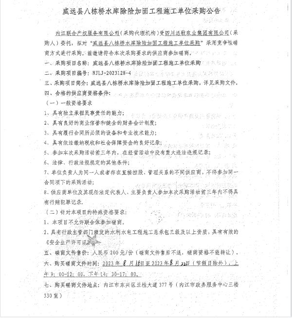 威遠縣八棟橋水庫除險加固工程施工單位采購公告