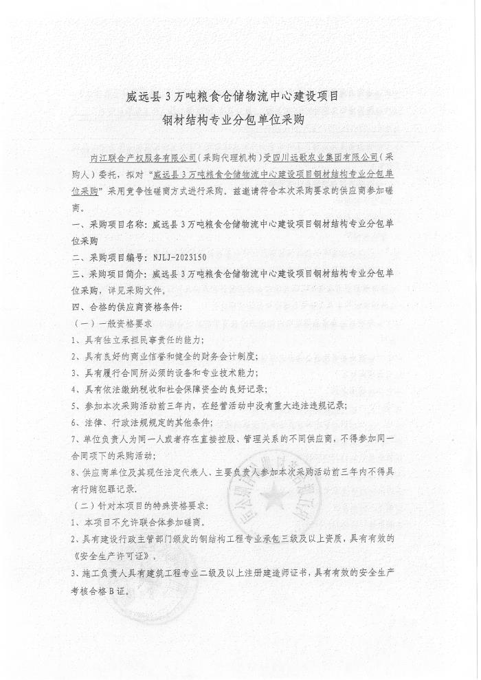威遠縣3萬噸糧食倉儲物流中心建設項目鋼材結構專業(yè)分包單位采購公告