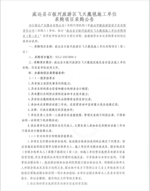 威遠(yuǎn)縣石板河旅游區(qū)飛天魔毯施工單位采購項(xiàng)目(第二次)采購公告
