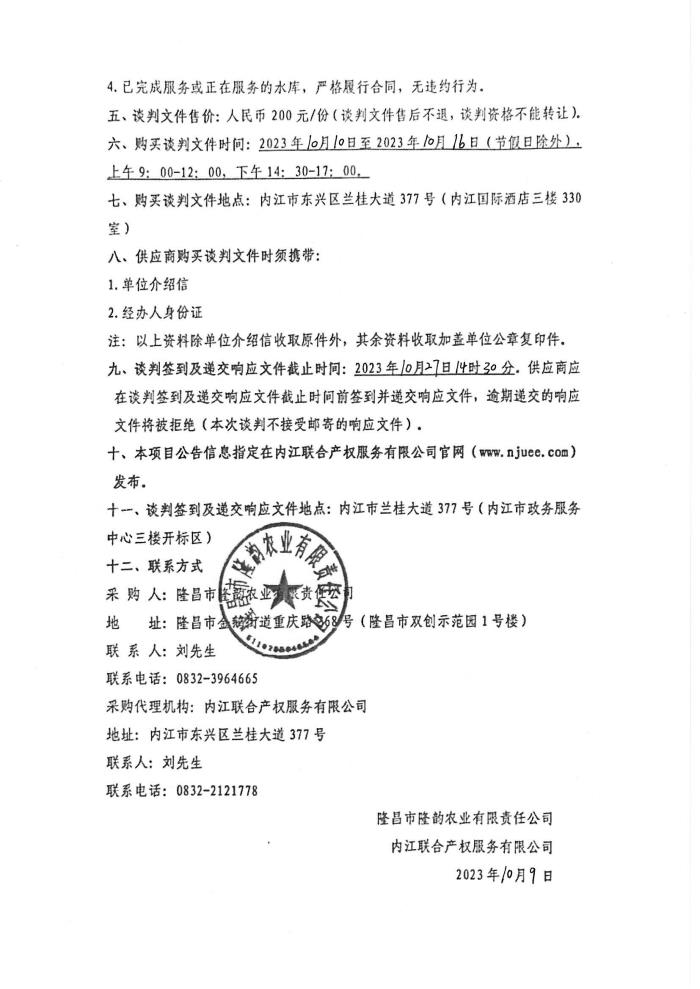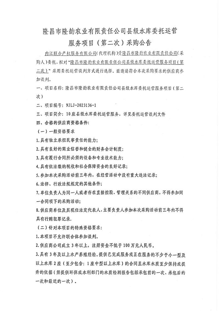 隆昌市隆韻農(nóng)業(yè)有限責(zé)任公司縣級(jí)水庫委托運(yùn)營服務(wù)項(xiàng)目(第二次)采購公告