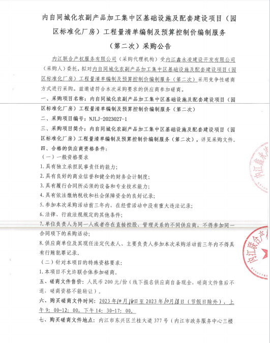 內(nèi)自同城化農(nóng)副產(chǎn)品加工集中區(qū)基礎(chǔ)設(shè)施及配套建設(shè)項目(園區(qū)標準化廠房)工程量清單編制及預(yù)算控制價編制服務(wù)(第二次)采購公告