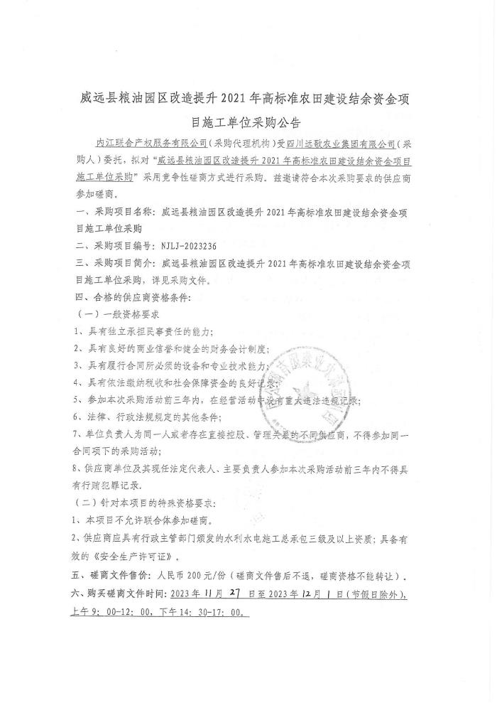 威遠(yuǎn)縣糧油園區(qū)改造提升2021年高標(biāo)準(zhǔn)農(nóng)田建設(shè)結(jié)余資金項目施工單位采購公告