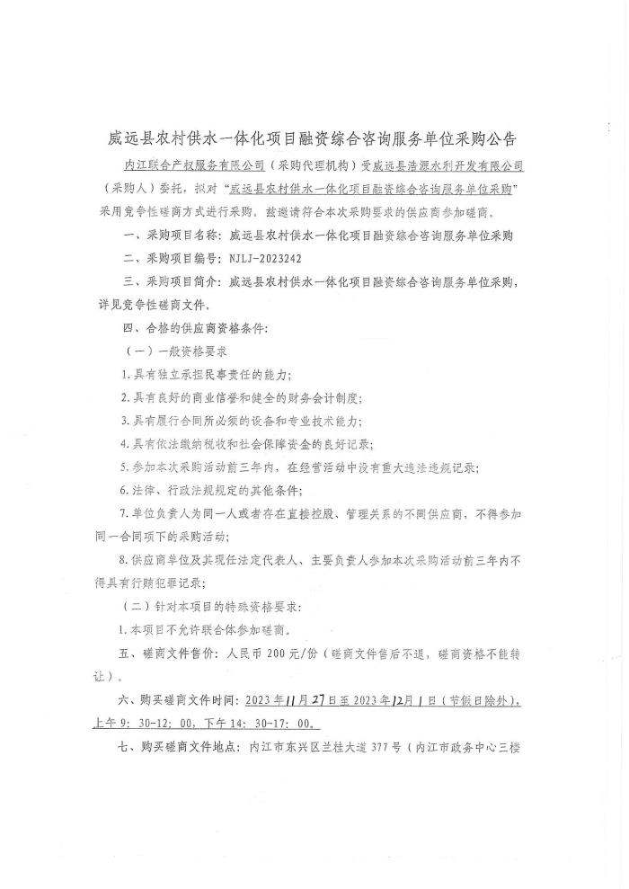 威遠(yuǎn)縣農(nóng)村供水一體化項(xiàng)目融資綜合咨詢(xún)服務(wù)單位采購(gòu)公告