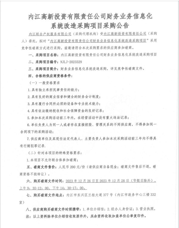 內(nèi)江高新投資有限責(zé)任公司財(cái)務(wù)業(yè)務(wù)信息化系統(tǒng)改造采購項(xiàng)目采購公告