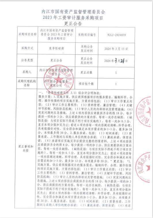 內(nèi)江市國有資產(chǎn)監(jiān)督管理委員會2023年工資審計服務(wù)采購項目更正公告