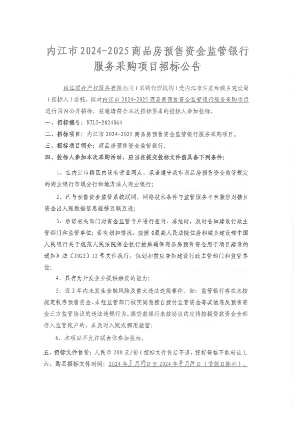 內(nèi)江市2024-2025商品房預(yù)售資金監(jiān)管銀行服務(wù)采購項(xiàng)目采購公告