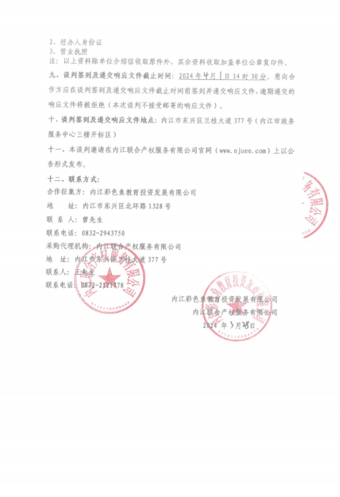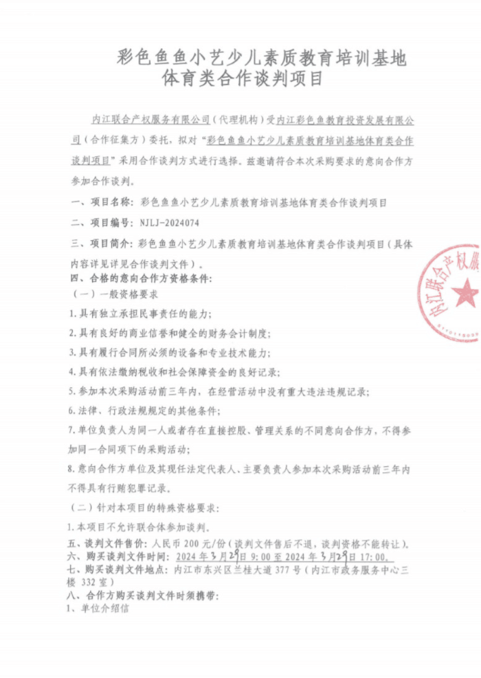 彩色魚魚小藝少兒素質(zhì)教育培訓(xùn)基地體育類合作談判項目采購公告