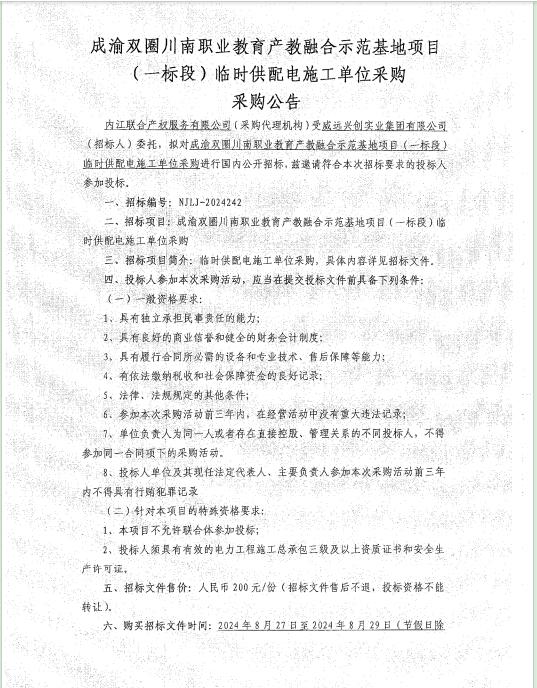 成渝雙圈川南職業(yè)教育產(chǎn)教融合示范基地項(xiàng)目(一標(biāo)段)臨時(shí)供配電施工單位采購采購公告