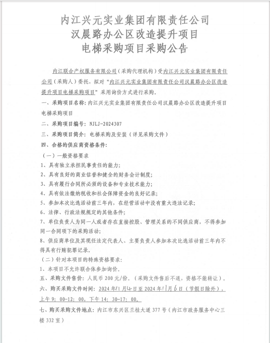 內(nèi)江興元實(shí)業(yè)集團(tuán)有限責(zé)任公司漢晨路辦公區(qū)改造提升項(xiàng)目電梯采購項(xiàng)目采購公告