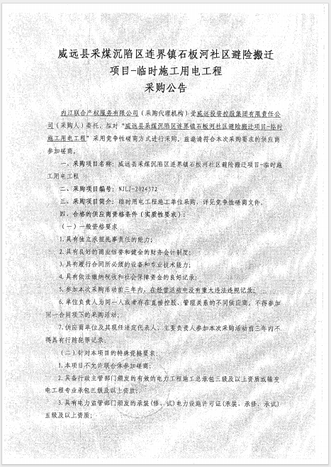 威遠縣采煤沉陷區(qū)連界鎮(zhèn)石板河社區(qū)避險搬遷 項目-臨時施工用電工程采購公告