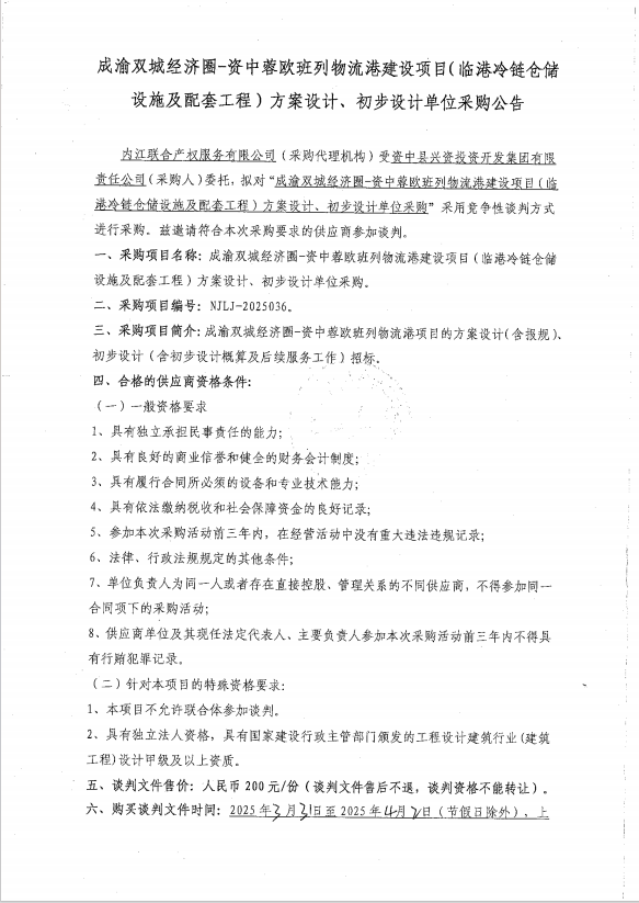 成渝雙城經(jīng)濟圈-資中蓉歐班列物流港建設(shè)項目(臨港冷鏈倉儲設(shè)施及配套工程)方案設(shè)計、初步設(shè)計單位采購公告