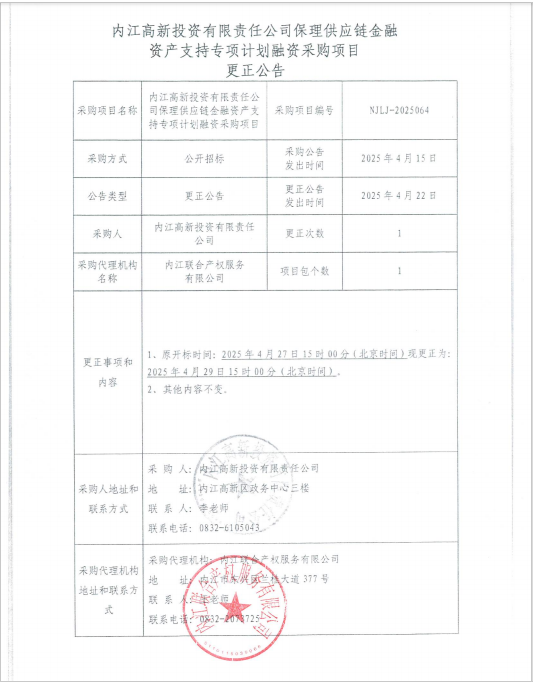 內(nèi)江高新投資有限責(zé)任公司保理供應(yīng)鏈金融資產(chǎn)支持專項計劃融資采購項目更正公告