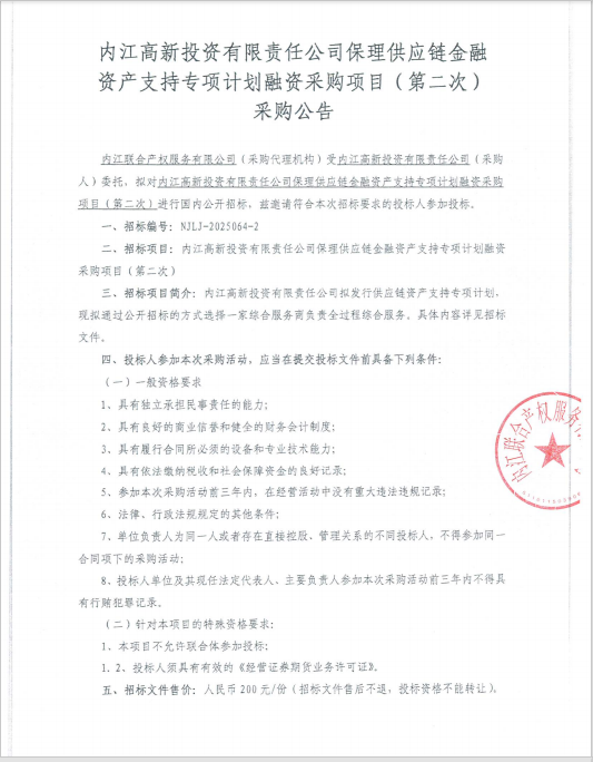 內(nèi)江高新投資有限責(zé)任公司保理供應(yīng)鏈金融資產(chǎn)支持專(zhuān)項(xiàng)計(jì)劃融資采購(gòu)項(xiàng)目(第二次)采購(gòu)公告