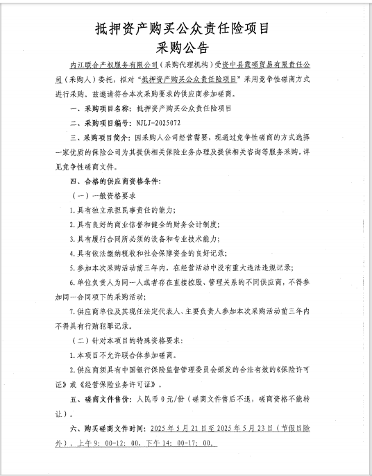 抵押資產(chǎn)購買公眾責(zé)任險(xiǎn)項(xiàng)目采購公告