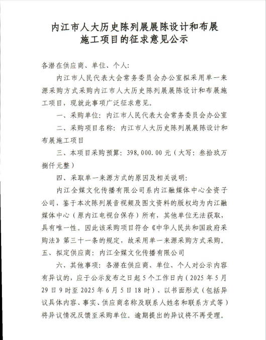 內(nèi)江市人大歷史陳列展展陳設(shè)計(jì)和布展施工項(xiàng)目的征求意見公示