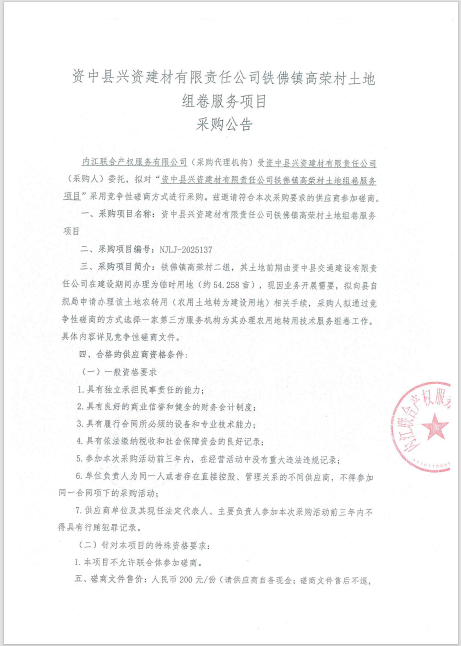 資中縣興資建材有限責(zé)任公司鐵佛鎮(zhèn)高榮村土地組卷服務(wù)項(xiàng)目采購(gòu)公告