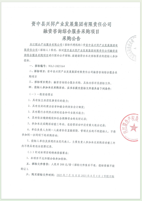 資中縣興昇產(chǎn)業(yè)發(fā)展集團有限責(zé)任公司融資咨詢綜合服務(wù)采購項目采購公告