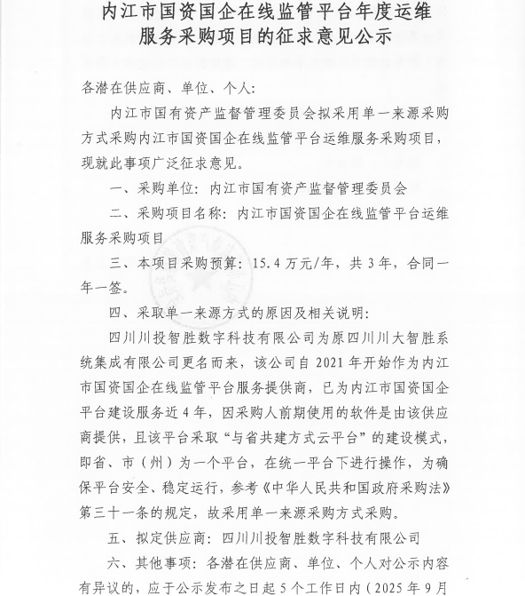 內(nèi)江市國資國企在線監(jiān)管平臺運維服務(wù)采購項目的征求意見公示