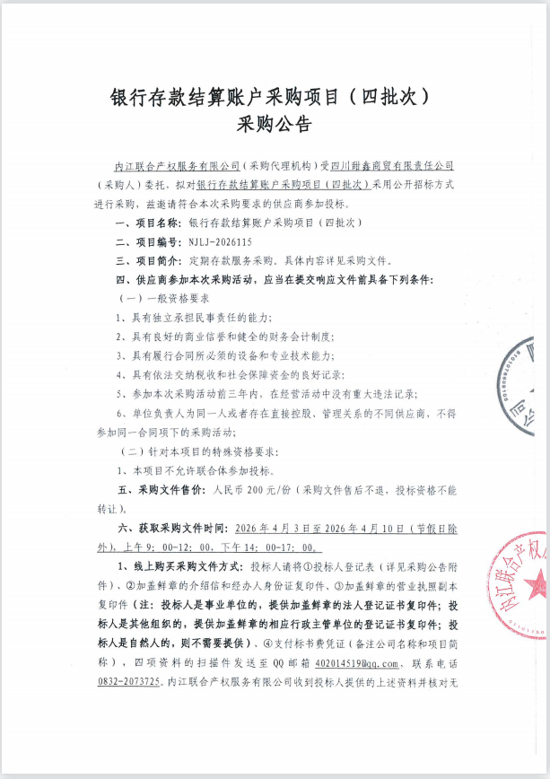 銀行存款結(jié)算賬戶采購(gòu)項(xiàng)目(四批次)采購(gòu)公告