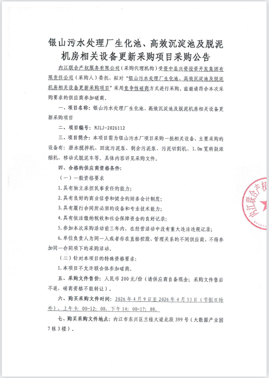 銀山污水處理廠生化池、高效沉淀池及脫泥機房相關(guān)設(shè)備更新采購項目