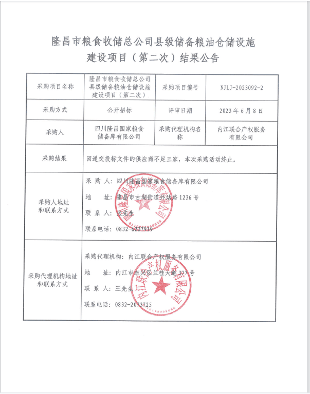 隆昌市糧食收儲總公司縣級儲備糧油倉儲設施建設項目(第二次)結果公告