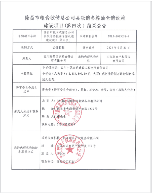 隆昌市糧食收儲總公司縣級儲備糧油倉儲設施建設項目(第四次)結(jié)果公告